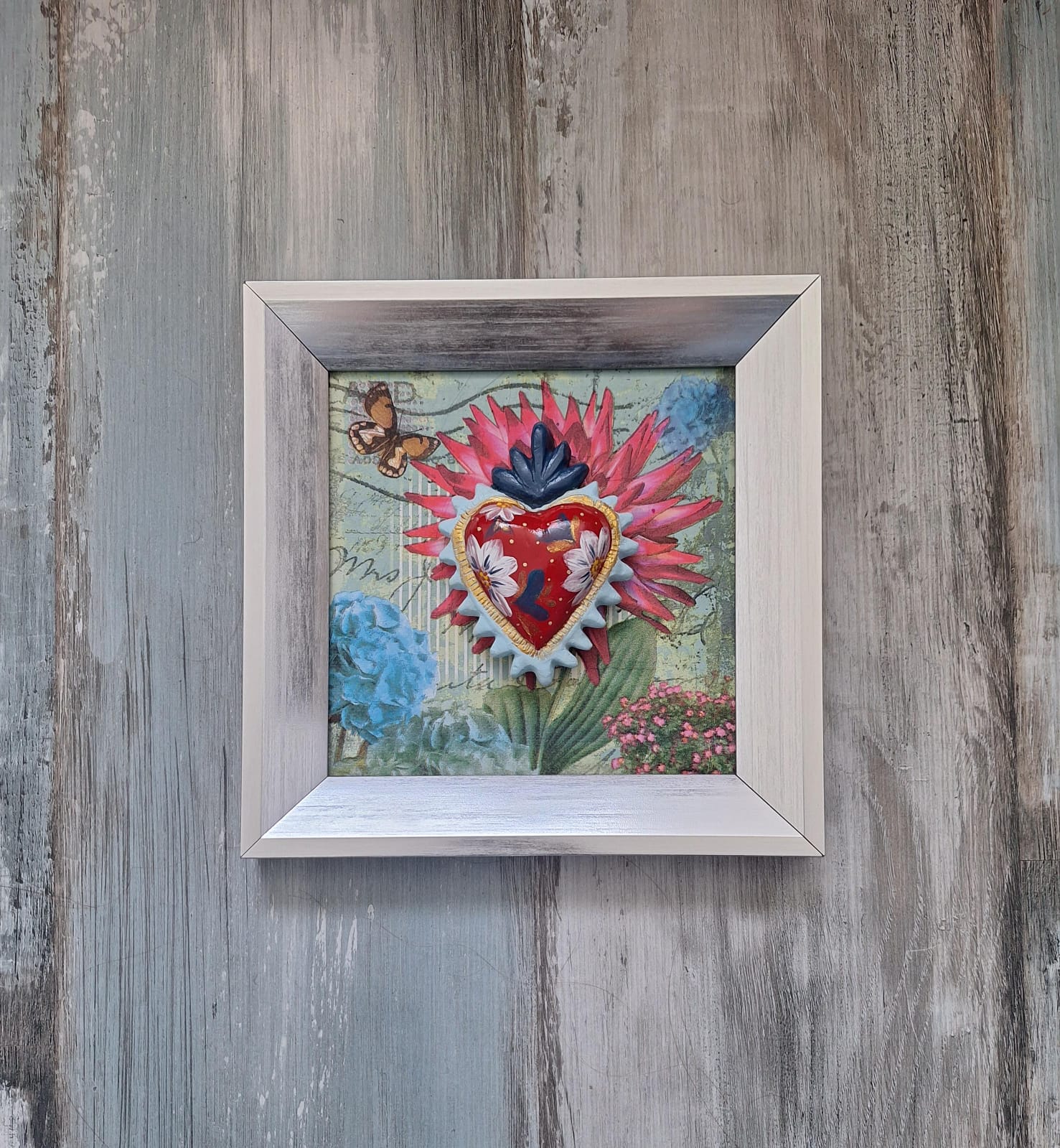 Cuadro madera 22×22 cm plateado con corazón ziña punta g 10cm pintado en acrilico y fondo decoupage.